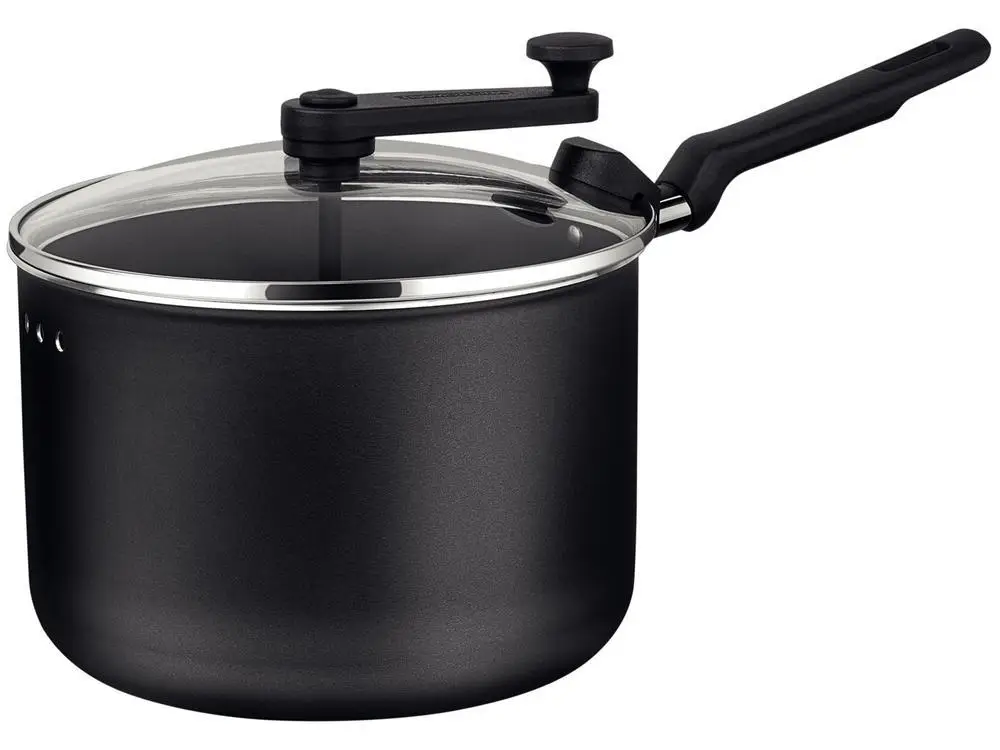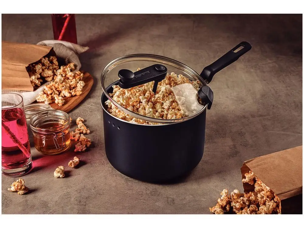 Nada melhor do que preparar aquela pipoca sequinha e crocante para o café da tarde ou para assistir ao seu filme favorito. A Tramontina apresenta a pipoqueira Loreto. Na cor grafite, ela é feita de alumínio com revestimento interno em Starflon Max, tem capacidade para 3,5 L, 20 cm de diâmetro e tampa de vidro temperado que não gira durante o preparo e se encaixa no cabo, que assim como o cabo, não esquenta e proporciona um manuseio muito mais seguro.